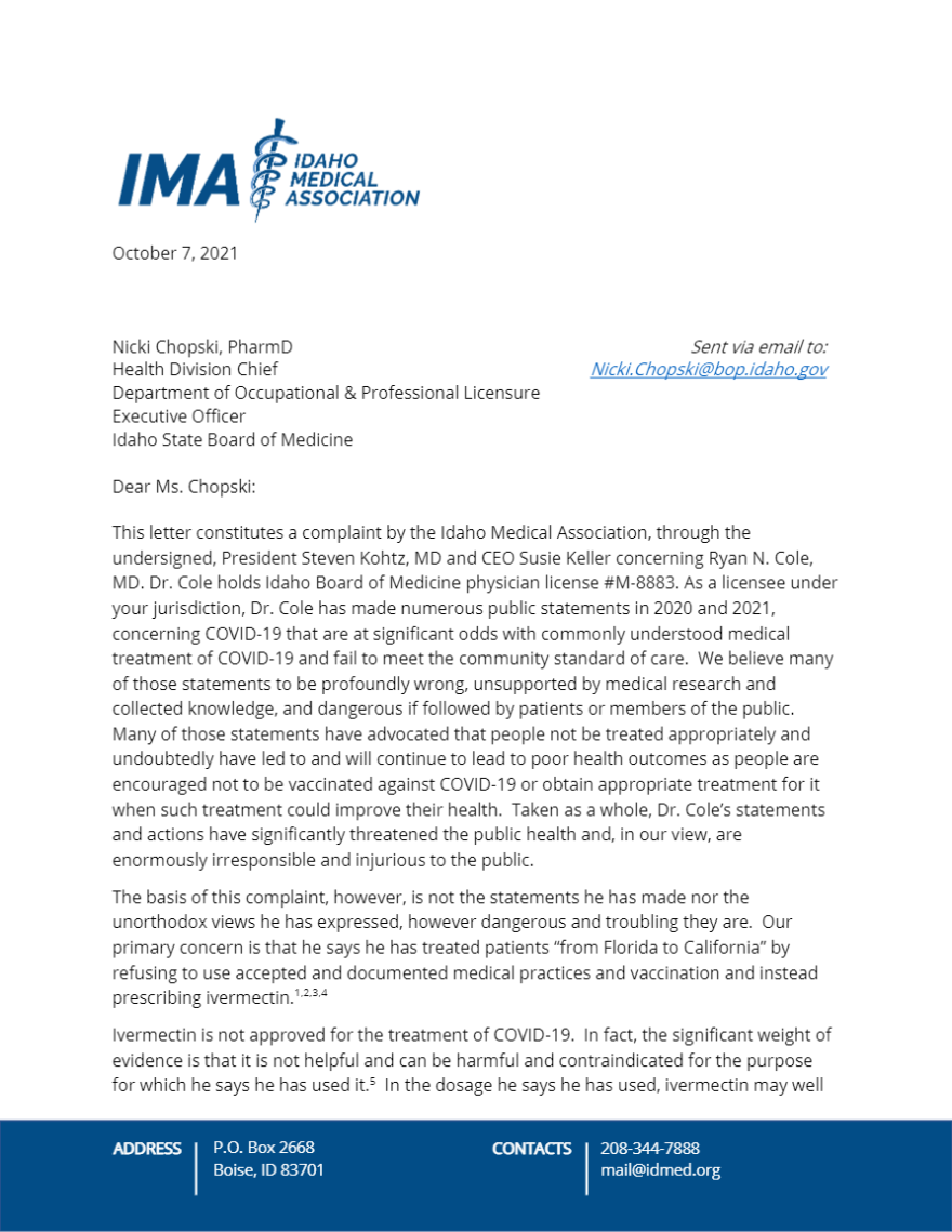 The association’s members “are very troubled about the misinformation and dangerous statements that Dr. Cole has made, but everyone has a right to speak freely,” Keller said in a phone interview. “But the notion that he is treating patients in a way that does not meet the Idaho standard of care is something that truly deserves the scrutiny of the Idaho Board of Medicine.”