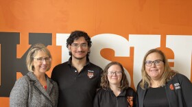 Dean Kandi Turley Ames talks with ISU debate coach Sarah Partlow Lefevre and team colleagues and married couple, Joseph and Alyson Tyler, winners of the final round of the CLIMB Online National Sweepstakes 2022.