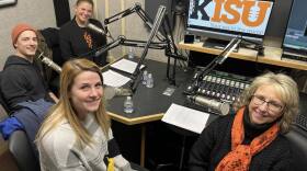 Dean Kandi Turley Ames talks with scholarship recipients Dani Mecham and Noah Leary about the impact of scholarships on their lives and the benefit of interdisciplinary study at ISU.